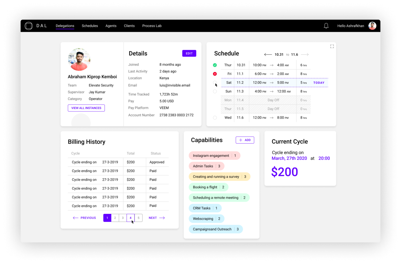 The agent dashboard allows Invisible's remote team of agent operators to see their schedule, performance score, skill set, amount earned, and tasks they could operate on in the task list.