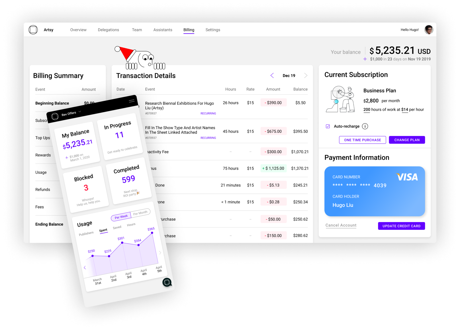 We realised that clients, rather then sending their delegations in by email, could use a dashboard to write and submit designs from. That dashboard could also be used to view the costs per delegation, overall spend, billing history, and chat. There was also a place to change their plan and credit card information.