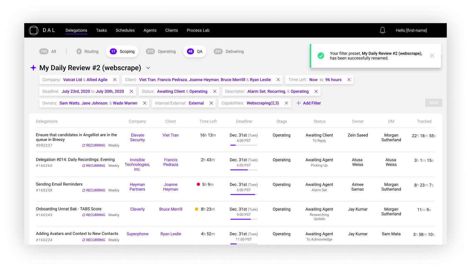 The Digital Assembly Line, or DAL, was the operations facing platform that allowed operation managers and operators to view tasks that have been delegated by the client.