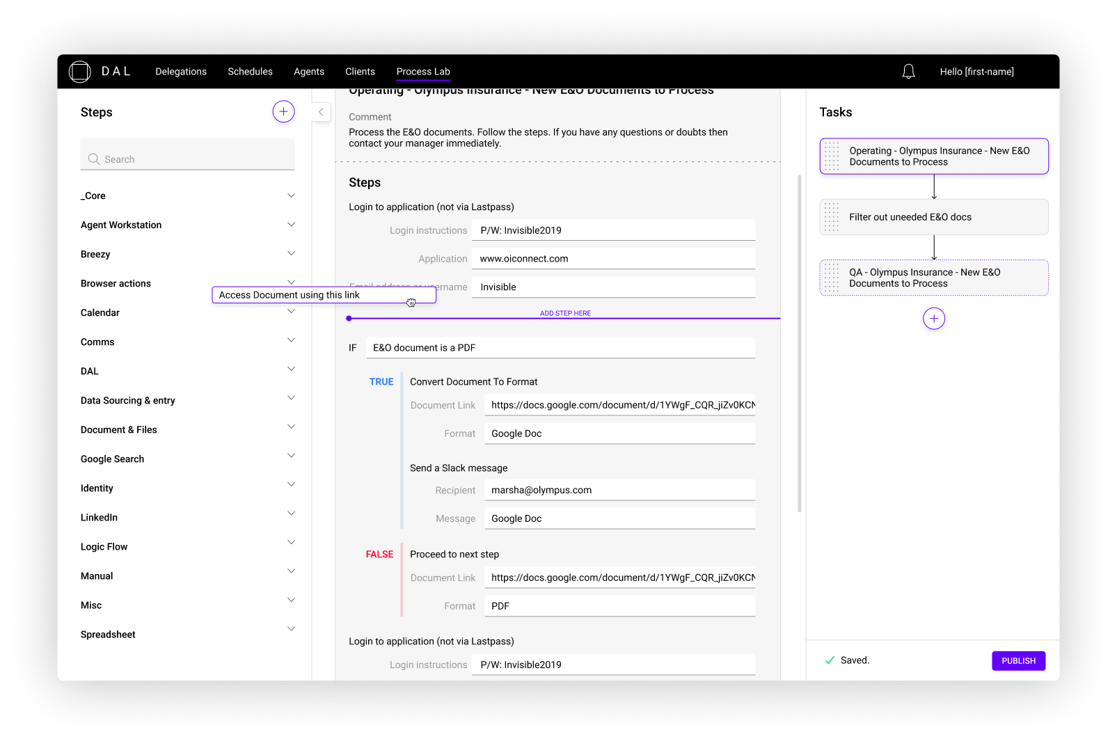 To facilitate this, I was tasked with designing a process builder sub-applications that would allow a human operator to come in, read the delegation, and translate it into a process by using the ap. They would drag step blocks into task blocks. Filling up each task block with the right order of steps. Logic could also be applied to the flow. Tasks were placed in the proper order and this created a process. Really delegations and processes were one in the same.